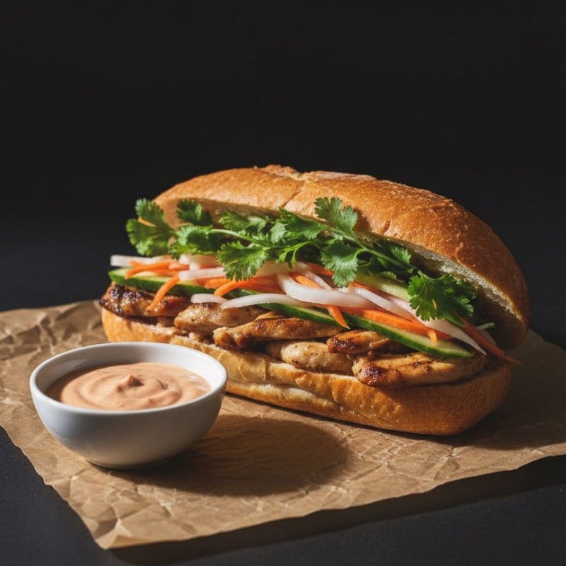 Křupavá bageta, paté, grilované kuře, nakládaná zelenina, chilli majonéza