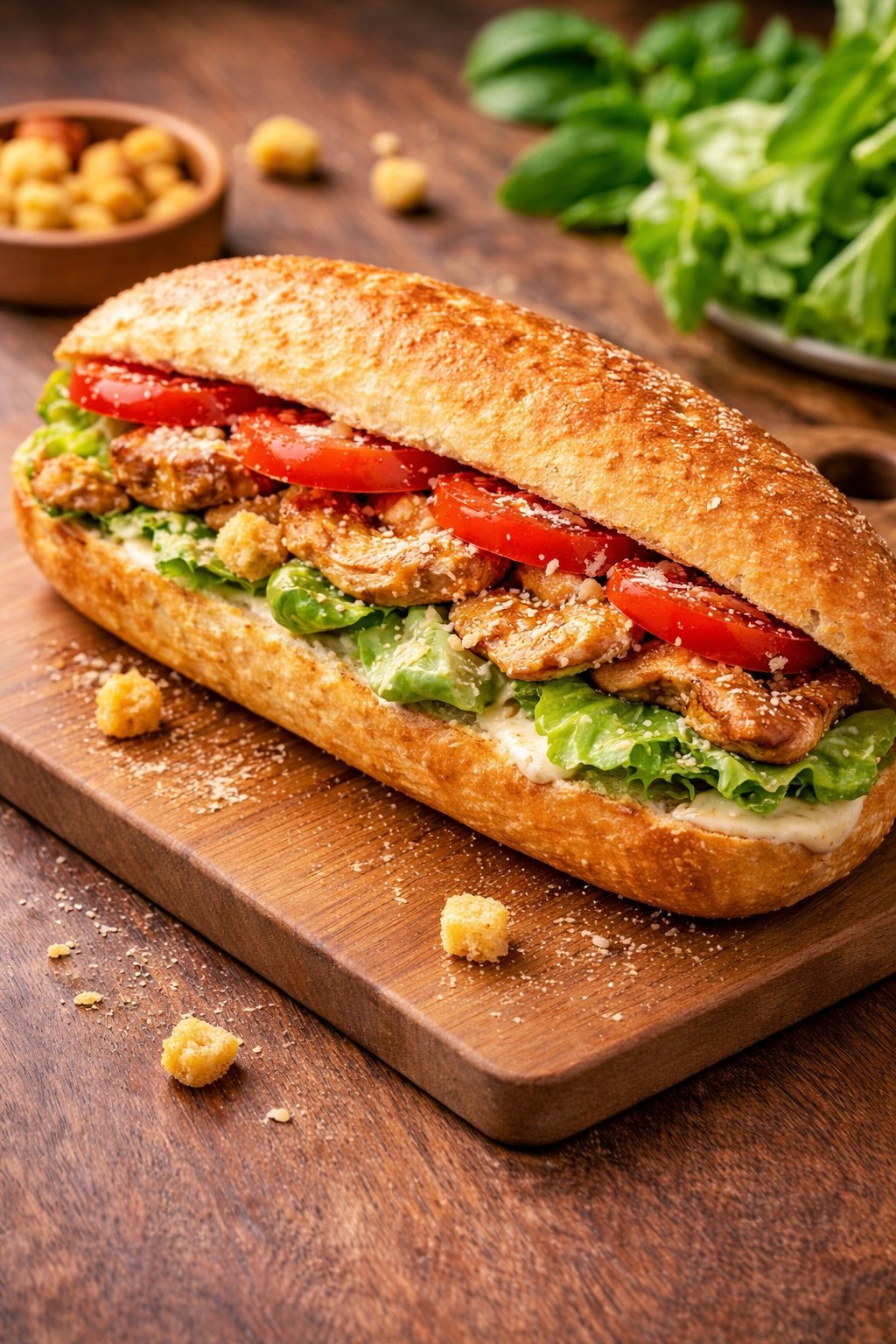 Křupavá domácí bageta, římský salát, rajče, grilované kuře, parmezán, Caesar dresink